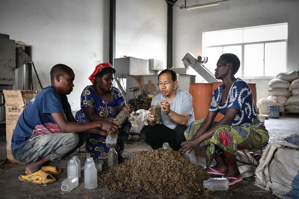 8月13日,在盧旺達南方省胡耶區(qū)的中國援盧農業(yè)技術示范中心,菌草專家陳曉斌(右二)與當地農民一起制作菌種培養(yǎng)料。