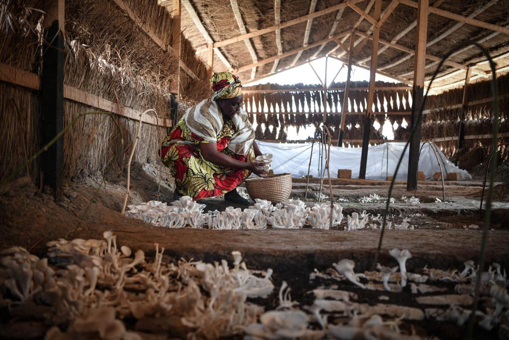 2月6日,在中非共和國達馬拉,法蒂瑪在菇棚內收獲菌草菇。
