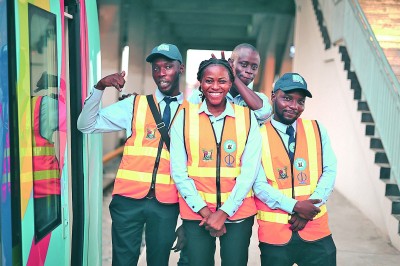 6月12日,在尼日利亞拉各斯,拉各斯輕軌藍(lán)線項(xiàng)目動(dòng)車組列車司機(jī)組長(zhǎng)伊莎貝拉·亞當(dāng)斯·伊斯拉埃爾(中)與同事在站臺(tái)上合影。新華社發(fā)