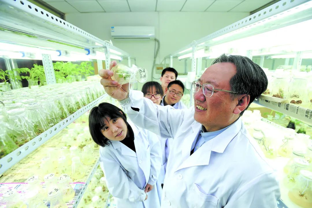沈陽農(nóng)業(yè)大學(xué)教授李天來院士在實驗室指導(dǎo)研究生開展科研,觀察番茄遺傳轉(zhuǎn)化過程等情況。