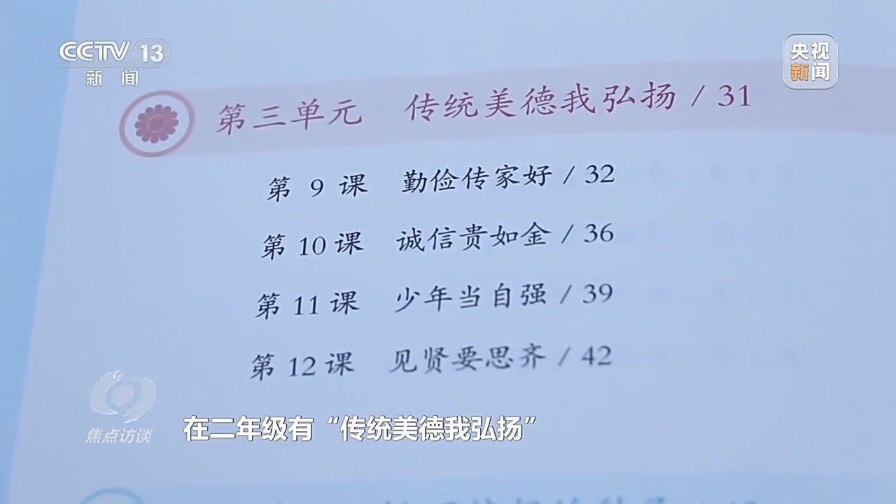 義務(wù)教育道德與法治統(tǒng)編教材編委會主任 孫蚌珠:為了讓學(xué)生循序漸進(jìn)地了解中華優(yōu)秀傳統(tǒng)文化,堅定文化自信,在二年級有“傳統(tǒng)美德我弘揚”,四年級有“博大精深的中華優(yōu)秀傳統(tǒng)文化”,七年級有“傳承中華優(yōu)秀傳統(tǒng)文化”,這樣層層遞進(jìn)。