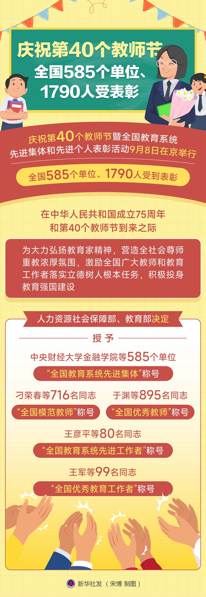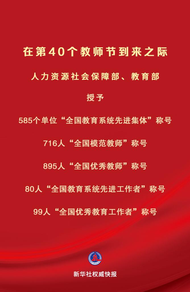 在中華人民共和國成立75周年和第40個教師節(jié)到來之際,為大力弘揚教育家精神,營造全社會尊師重教濃厚氛圍,激勵全國廣大教師和教育工作者落實立德樹人根本任務,積極投身教育強國建設,人力資源社會保障部、教育部決定授予中央財經(jīng)大學金融學院等585個單位“全國教育系統(tǒng)先進集體”稱號;授予刁榮春等716名同志“全國模范教師”稱號;授予于淵等895名同志“全國優(yōu)秀教師”稱號;授予王彥平等80名同志“全國教育系統(tǒng)先進工作者”稱號;授予王軍等99名同志“全國優(yōu)秀教育工作者”稱號。