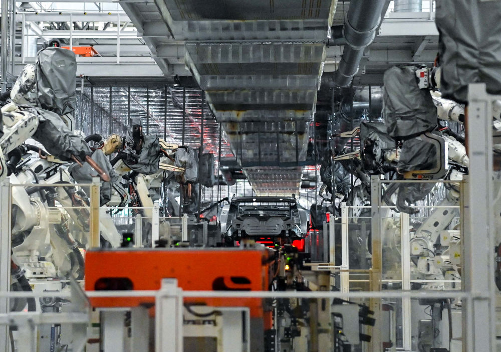 8月5日,在位于吉林省長(zhǎng)春市一汽紅旗制造中心繁榮廠區(qū)的焊裝車(chē)間內(nèi),焊裝機(jī)器人在生產(chǎn)線上焊接車(chē)身。新華社記者 顏麟蘊(yùn) 攝