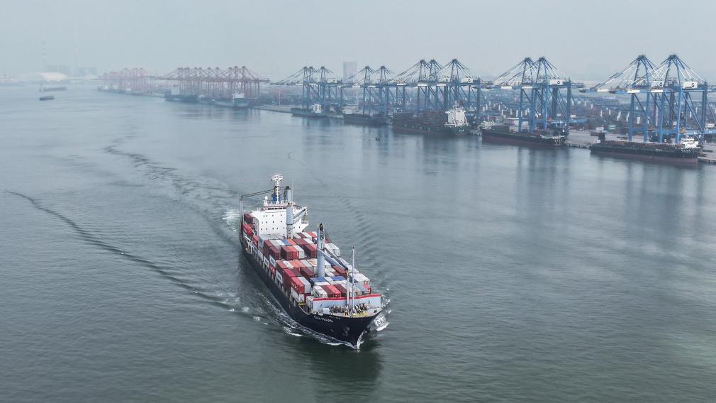 2024年9月14日,一艘滿載集裝箱的海輪駛離欽州港碼頭(無人機照片)。新華社記者 張愛林 攝