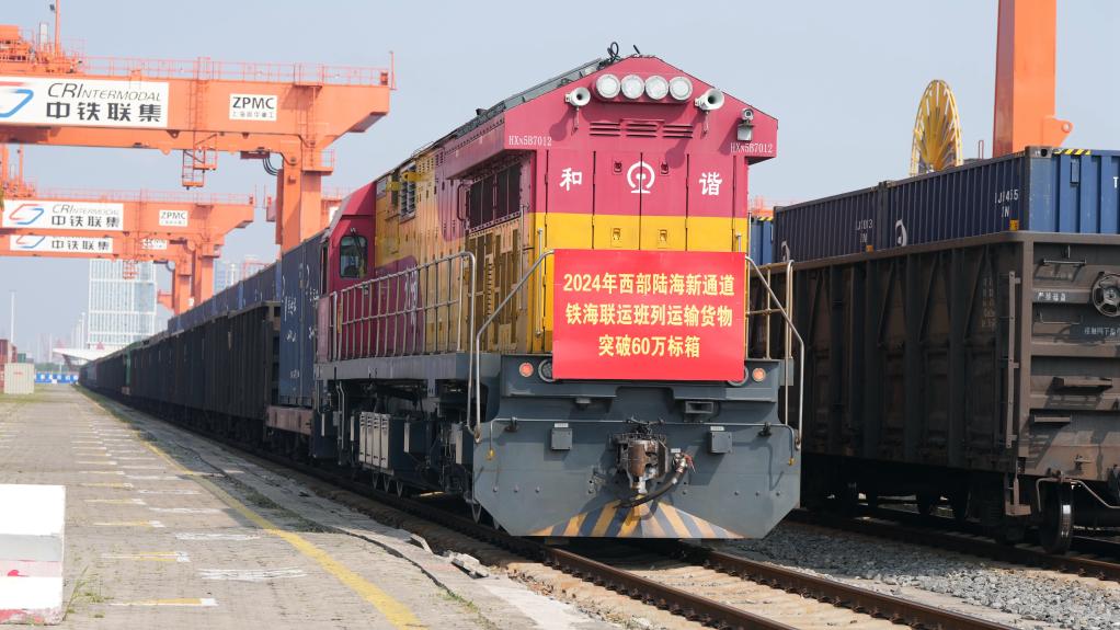 2024年9月14日,一列帶有突破60萬標箱標志的鐵海聯(lián)運班列準備從欽州鐵路集裝箱中心站駛出。新華社記者 張愛林 攝