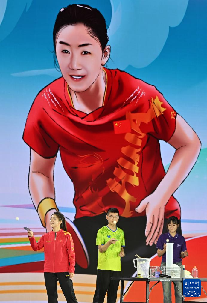 9月21日,奧運(yùn)冠軍陳夢(左一)在臺上和學(xué)生互動。新華社記者 李然 攝