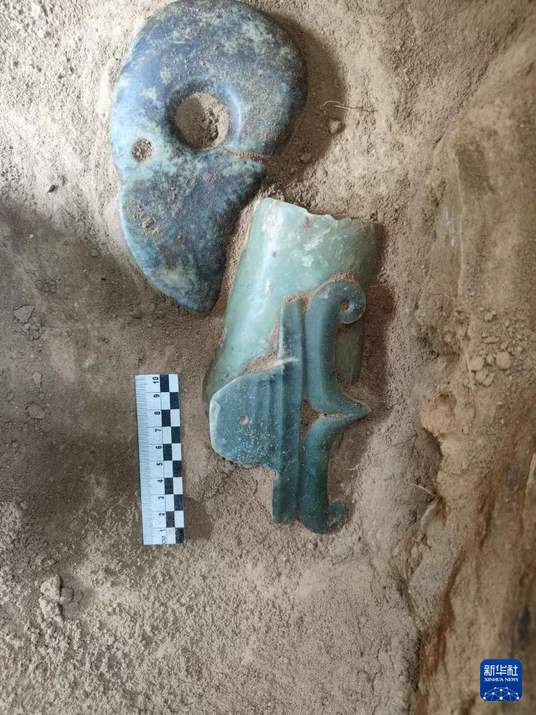 元寶山積石冢遺址隨葬玉器出土現(xiàn)場(資料照片)。新華社發(fā)
