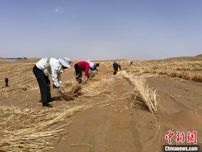 2024年6月,河西走廊—塔克拉瑪干沙漠邊緣阻擊戰(zhàn)工程固沙現(xiàn)場。 (阿拉善右旗宣傳部供圖)