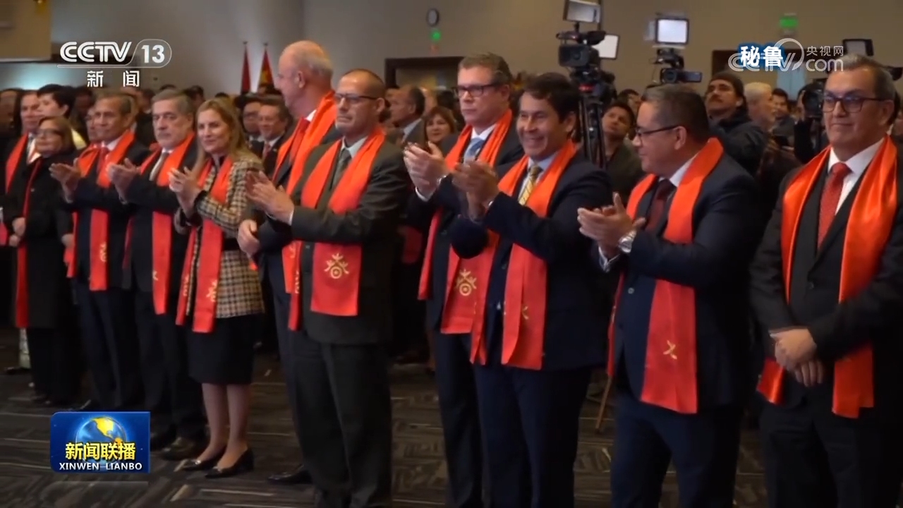 在中國駐秘魯大使館舉辦的慶?;顒又校忻馗鹘缛耸繜崃易YR新中國國慶。與會嘉賓共同欣賞兩國名曲,觀看中秘合作成果展等。