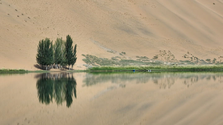 巴丹吉林沙漠的奇絕,還在其秀美的湖。144個大小湖泊形狀、顏色各異。沙漠中最大最深的湖泊諾日圖湖,水域面積約147平方公頃,最大水深約26米。由于礦物質(zhì)和鹵蟲等生物含量不同,不少湖泊在陽光照耀下呈現(xiàn)不同色彩,有四季深淺不一的紅色和紫色,甚至還有雙色。巴丹湖是沙漠中為數(shù)不多的淡水湖,細(xì)看水中還有魚類游動。音德日圖湖的湖心小島上,涌出百余個泉眼,泉水涓淌不止,蔚為壯觀。