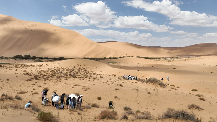 2024年7月31日,來自蘭州大學(xué)、香港浸會大學(xué)、西南大學(xué)等18所高校的100余位師生在巴丹吉林沙漠開展“發(fā)現(xiàn)計劃”地理學(xué)聯(lián)合實習(xí),這是部分師生在巴丹吉林沙漠中開展植被樣方調(diào)查(無人機(jī)照片)。