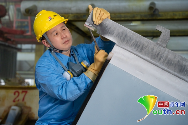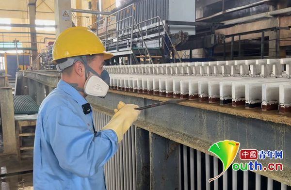 柳祥國(guó)在檢查陰極板導(dǎo)電頭。中國(guó)青年網(wǎng)記者 高蕾 攝