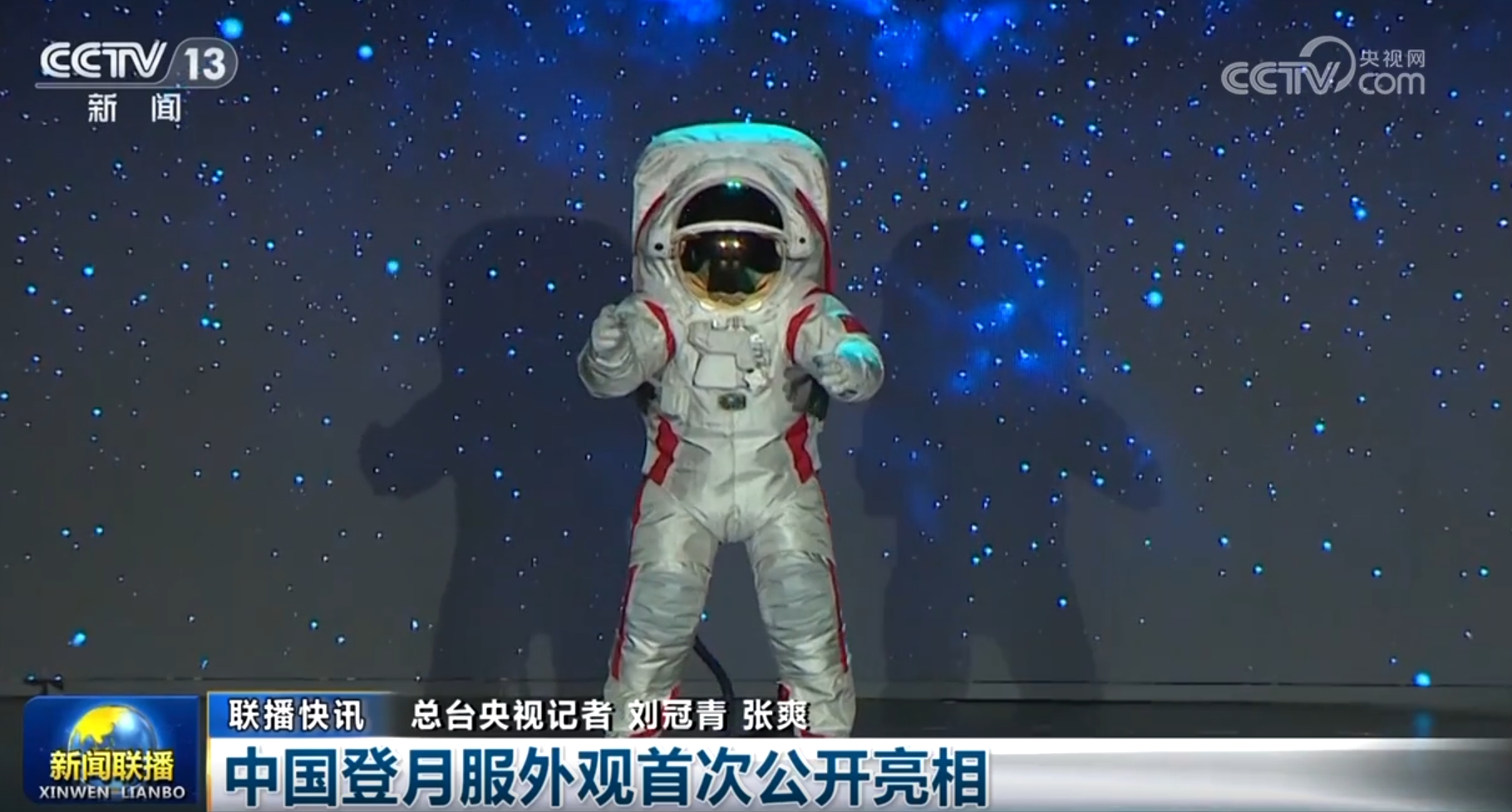 9月28日,中國載人航天工程辦公室面向社會發(fā)布登月服征名活動,并首次公開中國登月服外觀。此次亮相的中國登月服外觀,上身裝飾帶設計融合了飛天飄帶的優(yōu)雅飄逸和傳統(tǒng)鎧甲的硬朗厚重,體現(xiàn)了剛?cè)岵闹袊軐W;腿部裝飾帶設計成火箭升空尾焰造型,與上身呼應,形成一飛沖天的勢態(tài),體現(xiàn)了中國騰飛的設計理念。
