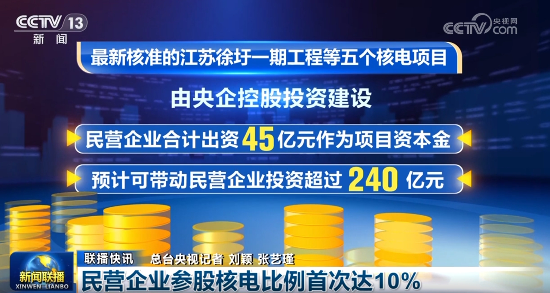 記者從國家發(fā)展改革委了解到,近期國務院核準的江蘇徐圩一期工程等五個核電項目,由央企控股投資建設,民營企業(yè)合計出資45億元作為項目資本金,預計可帶動民營企業(yè)投資超過240億元。民營企業(yè)參股核電的比例首次提高到了10%,核電領(lǐng)域進一步向民資放開。