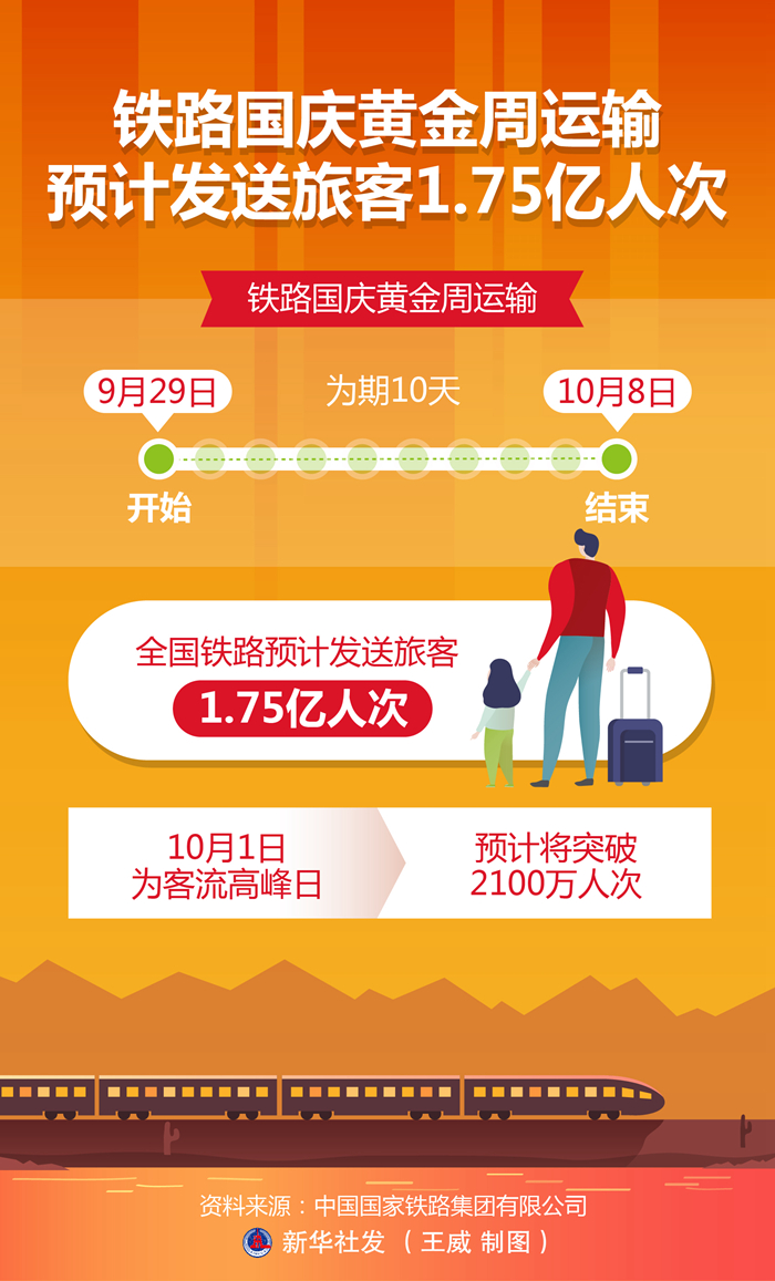記者從中國國家鐵路集團有限公司獲悉,鐵路國慶黃金周運輸自9月29日開始,至10月8日結(jié)束,為期10天,全國鐵路預(yù)計發(fā)送旅客1.75億人次,10月1日為客流高峰日,預(yù)計將突破2100萬人次。