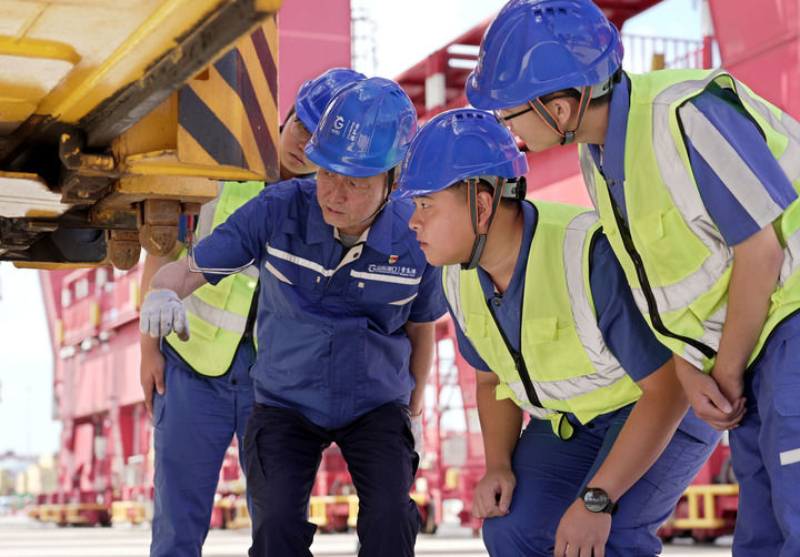 許振超(左二)和團隊成員在山東港口青島港集裝箱碼頭研究傳統(tǒng)集裝箱橋吊的智能化升級方案(2024年9月2日攝)。新華社發(fā)(閆軍 攝)