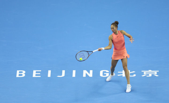 10月2日,鄭欽文在比賽中回球。當(dāng)日,在北京進(jìn)行的2024中國網(wǎng)球公開賽女子單打第四輪比賽中,中國選手鄭欽文2比1戰(zhàn)勝美國選手阿尼西莫娃,晉級(jí)八強(qiáng)。新華社發(fā)(杜昕怡攝)