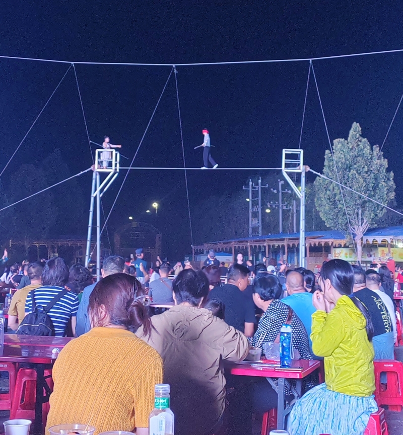 夜幕降臨,華燈初上,阿克蘇老街夜市美食與文化的融合相得益彰。特色烤包子、烤全羊、抓飯、肚包肉等美食的香氣與攤主的叫賣聲交織在一起;民族樂器、木盤、木碗、木勺等非遺產(chǎn)品,既有滄桑感,更有文化味;達(dá)瓦孜表演中,兩名演員在手持平衡桿,在高空繩索上表演前后走動、盤腿端坐、蒙眼行走、飛身跳躍等一系列驚心動魄的技藝,引得觀眾拍手稱絕;賽乃姆、龜茲樂舞等讓人們感受到了中華文化的魅力和深厚底蘊(yùn)。