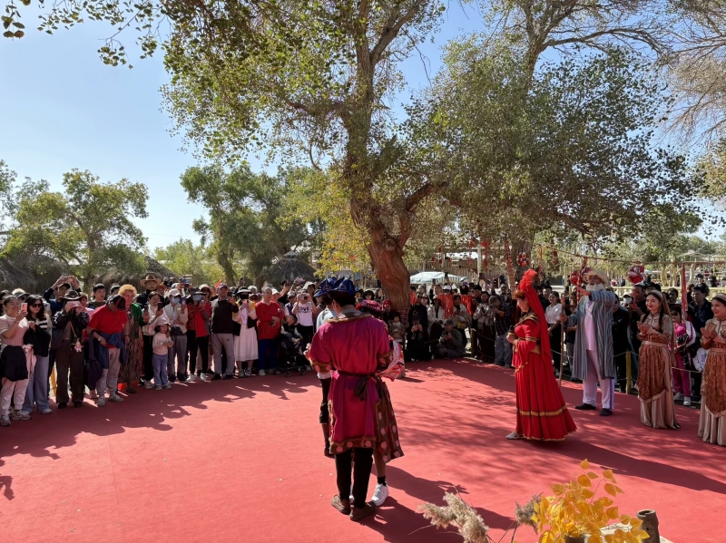 國慶期間,游客在觀看尉犁縣羅布人村寨景區(qū)民俗表演。 羅布人村寨景區(qū)供圖