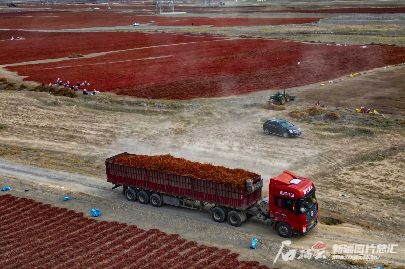 10月3日,貨運汽車在沙灣市安集海鎮(zhèn)萬畝天然曬場轉運辣椒(無人機攝)。