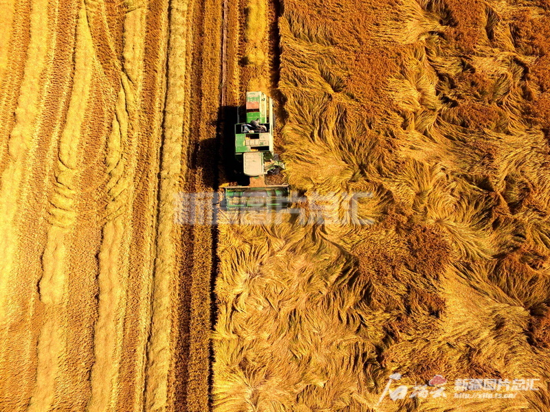 2016年10月11日,新疆生產(chǎn)建設(shè)兵團(tuán)第一師原阿拉爾農(nóng)場(chǎng)職工在收割水稻。王志清攝