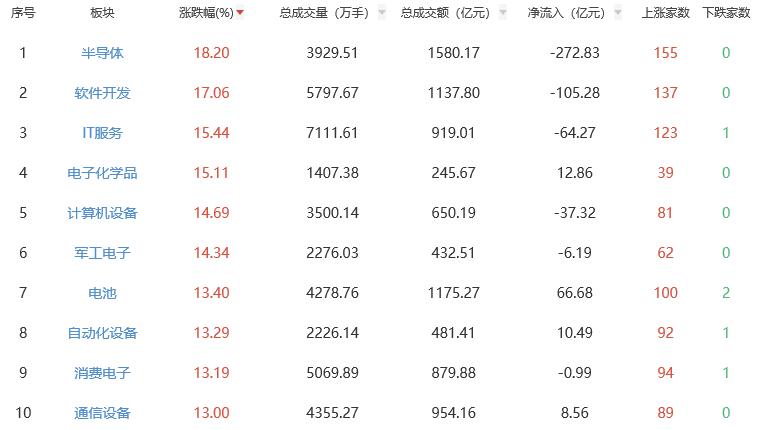 板塊方面,半導體、軟件開發(fā)、IT服務、電子化學品、計算機設備等漲幅居前。