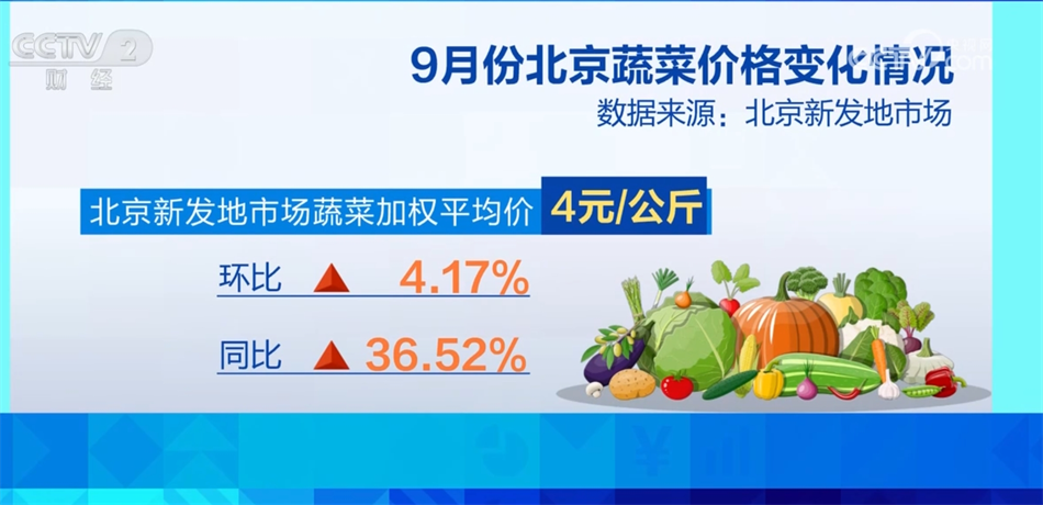 不僅西紅柿,豆角、芹菜、西蘭花等蔬菜也由于產(chǎn)地降雨造成了種植期推遲、上市期延后,近期供應(yīng)偏緊,價(jià)格上漲明顯,像目前芹菜的價(jià)格為每斤3元,比去年同期每斤上漲了2元。整個(gè)9月份,北京新發(fā)地市場(chǎng)蔬菜的加權(quán)平均價(jià)為每公斤4元,比8月份上漲4.17%,比去年同期上漲36.52%。