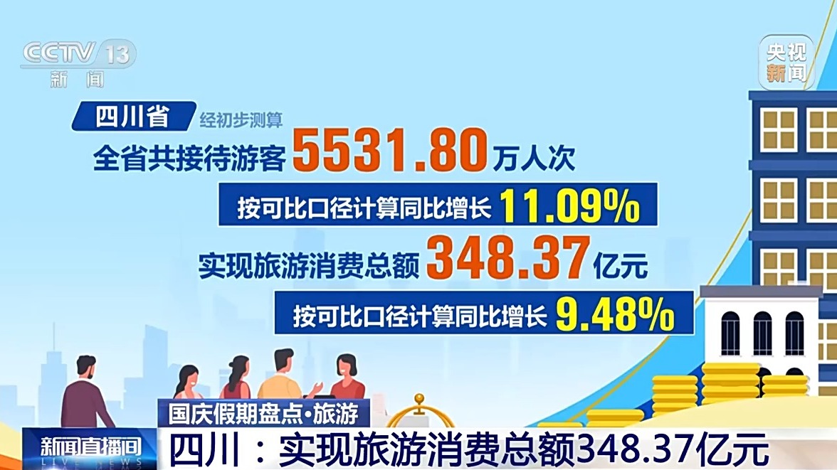四川省經(jīng)初步測算,全省共接待游客5531.80萬人次,實現(xiàn)旅游消費總額348.37億元,按可比口徑計算,同比分別增長11.09%和9.48%。全省核心旅游景區(qū)“狀態(tài)拉滿”,17家5A級景區(qū)累計接待游客426.93萬人次、實現(xiàn)門票收入1.85億元,同比分別增長25.06%和15.48%,超越假日歷史最高水平。九寨溝景區(qū)連續(xù)4天均達4.1萬人承載量上限。