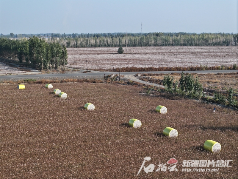 10月10日,沙灣市大泉鄉(xiāng)燒坊莊子村的萬畝棉田,一個個打包好的“金蛋蛋”散落在田間。孫志坤 攝