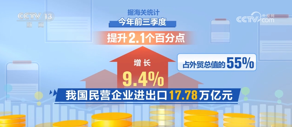據(jù)海關(guān)統(tǒng)計(jì),今年前三季度,我國民營企業(yè)進(jìn)出口17.78萬億元,增長(zhǎng)9.4%,占外貿(mào)總值的55%,提升2.1個(gè)百分點(diǎn);外商投資企業(yè)進(jìn)出口9.53萬億元,增長(zhǎng)1.1%,連續(xù)兩個(gè)季度增長(zhǎng);國有企業(yè)進(jìn)出口4.95萬億元,增長(zhǎng)0.1%。