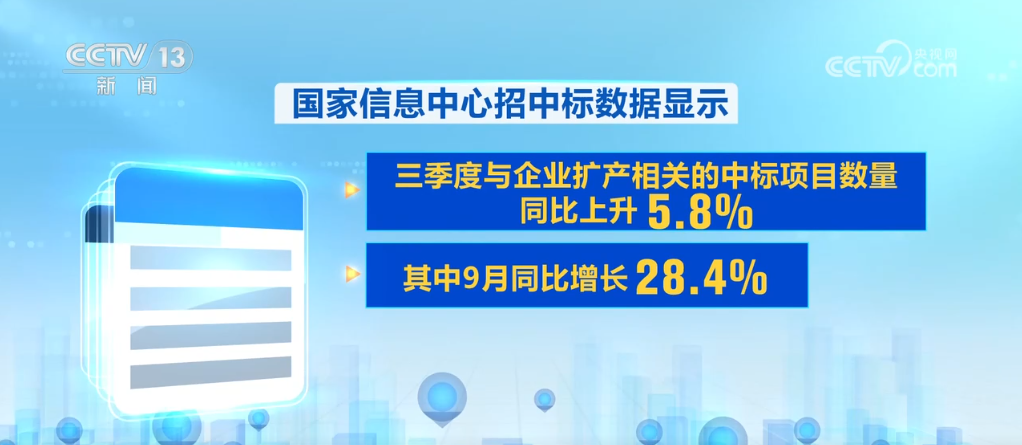 不僅工程建設(shè)在提速,作為項(xiàng)目落地的第一步,中標(biāo)數(shù)據(jù)也在快速增長(zhǎng)。國(guó)家信息中心招中標(biāo)數(shù)據(jù)顯示,三季度與企業(yè)擴(kuò)產(chǎn)相關(guān)的中標(biāo)項(xiàng)目數(shù)量同比上升5.8%,其中9月同比增長(zhǎng)28.4%,為今年以來最高增速,企業(yè)擴(kuò)產(chǎn)熱度回升明顯。