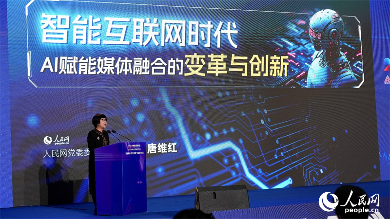 人民網(wǎng)監(jiān)事會(huì)主席、研究院院長唐維紅發(fā)表題為《智能互聯(lián)網(wǎng)時(shí)代AI賦能媒體融合的變革與創(chuàng)新》的主題報(bào)告。人民網(wǎng)記者 吳茜薇攝