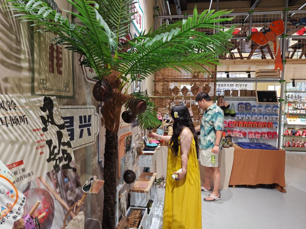 在老街一家非遺文創(chuàng)店里,來自浙江杭州的游客王銣斐正在挑選用椰子殼制作的冰箱貼,準備作為禮物送給朋友。