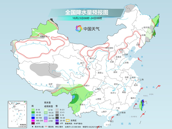 后天,新疆沿天山地區(qū)和南疆西部山區(qū)、西藏北部、青海中南部、川西高原北部等地部分地區(qū)有小到中雪或雨夾雪。云南西北部、臺(tái)灣島大部等地部分地區(qū)有中到大雨,其中,臺(tái)灣島中東部等地部分地區(qū)有暴雨或大暴雨(100~200毫米)。