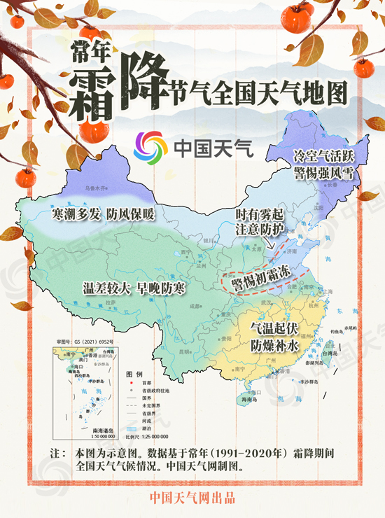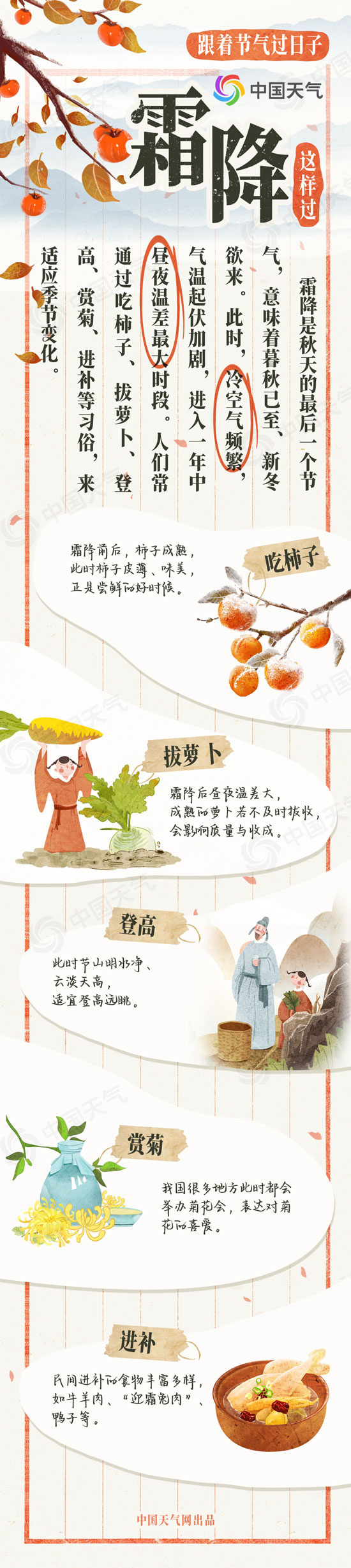 春生夏長(zhǎng),秋收冬藏,跟著節(jié)氣過(guò)日子。今天(10月23日)進(jìn)入秋天的最后一個(gè)節(jié)氣——霜降,意味著暮秋已至、新冬欲來(lái)。此時(shí),冷空氣頻繁,氣溫起伏加劇,進(jìn)入一年中晝夜溫差最大時(shí)段。人們常通過(guò)吃柿子、拔蘿卜、登高、賞菊、進(jìn)補(bǔ)等習(xí)俗,來(lái)適應(yīng)季節(jié)變化。中國(guó)天氣網(wǎng)特別推出霜降風(fēng)俗圖鑒和霜降全國(guó)天氣地圖,看看這個(gè)節(jié)氣怎么過(guò)。