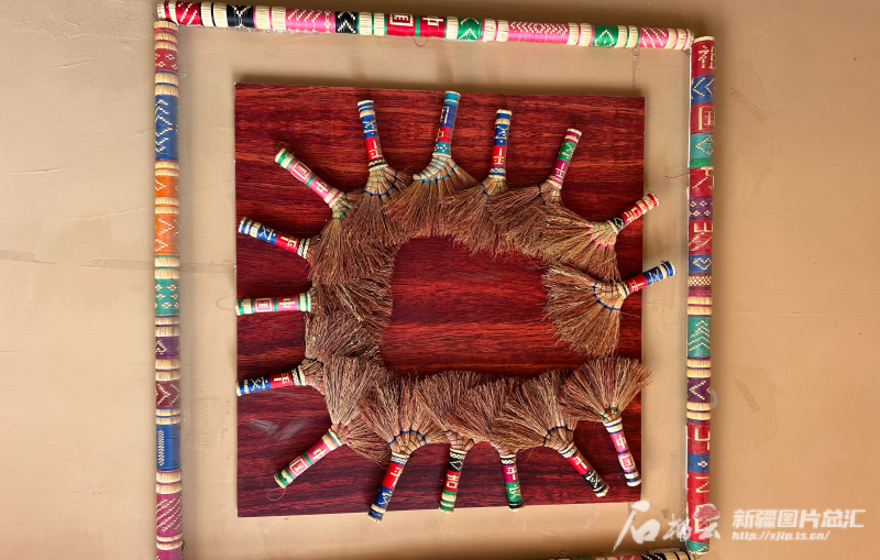 疏附縣托克扎克鎮(zhèn)阿亞格曼干村手工掃把工藝坊里,村民依巴古麗·阿布都克然用掃把做的旅游紀(jì)念品。石榴云/新疆日報記者 拍熱扎提·阿不都攝