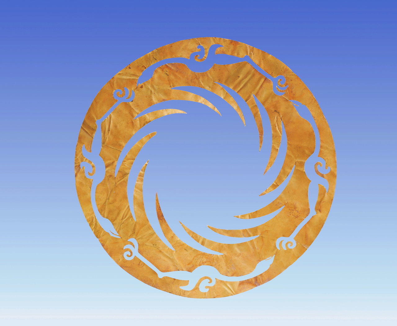 薄薄的一片,斜躺在透明展臺上,緩緩做360度旋轉(zhuǎn)。它的大小跟一張CD差不多,由含金量高達(dá)94.2%的金箔片制作,厚度僅0.02厘米。圖案分為內(nèi)外兩層,外層分布由等距的12條象征太陽的光芒組成,內(nèi)層由4只首尾相接的逆時針飛翔的太陽神鳥組成。整個圖案均衡對稱,充滿動感。
