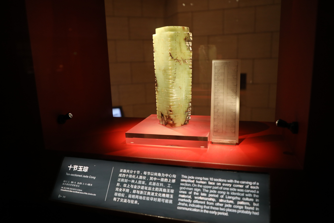 金沙遺址博物館鎮(zhèn)館之寶之一——十節(jié)琮,高22.2厘米,全器分十節(jié),每節(jié)有四個簡化的神人面紋,在上端的一面還陰刻有一神人圖案。這件玉琮的質(zhì)地與金沙遺址的其他玉琮完全不同,其造型風(fēng)格、紋樣圖案、制作工藝都與長江下游的良渚文化一致,應(yīng)是早于金沙1000多年的良渚人的產(chǎn)品。圖片由金沙遺址博物館提供