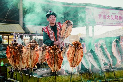 尉犁縣羅布人村寨的烤魚(yú)美食。宋唯一攝