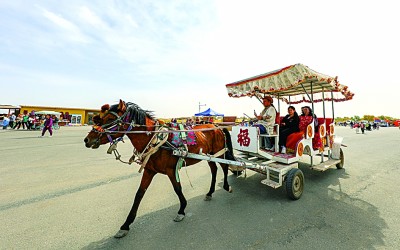 游客在尉犁縣羅布人村寨乘坐馬車(chē)。汪志鵬攝
