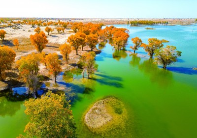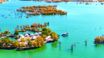 站在高處放眼望去,大片的胡楊林仿佛被溫柔的霞光所籠罩,明黃色的胡楊葉如同滿天繁星,在水面上輕輕搖曳。走進(jìn)胡楊林深處,可見(jiàn)漢唐烽燧、太陽(yáng)墓、祭臺(tái),每一處文化遺存都透著原始與神秘,仿佛將一個(gè)個(gè)古老的傳說(shuō)向人娓娓道來(lái)。