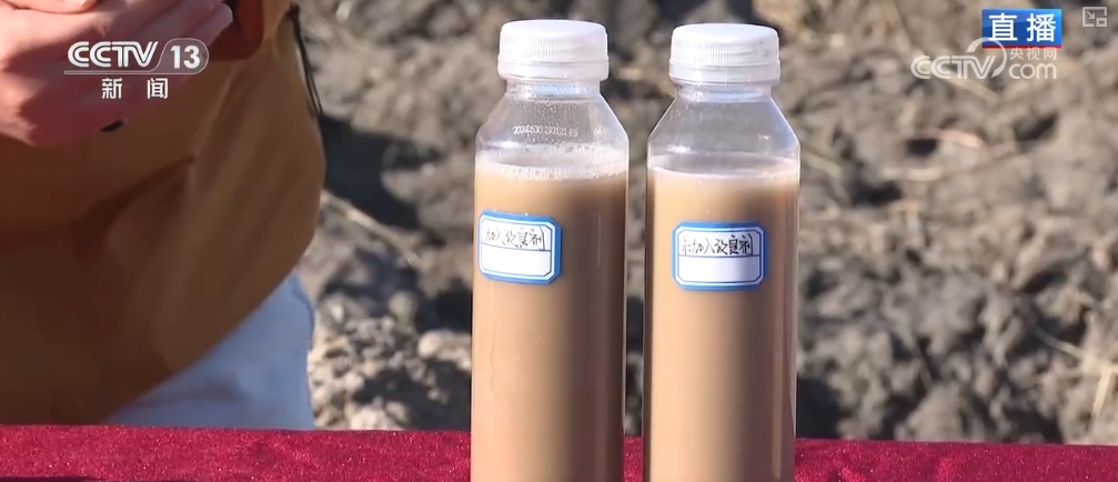 這片田采用的是有機硅改良劑來治理的鹽堿地,選取同地塊的鹽堿土溶于水中,加入有機硅后,土壤和水快速分層。可以看到,有機硅具有較強的親土性,可以和土壤包裹一起,阻斷鹽分吸收,從而達到降堿和改變土壤板結(jié)的作用。這能讓水稻更好地扎根生長,渾濁的水變清澈,也可以增加作物的光合作用,有效治理重度鹽堿土壤。
