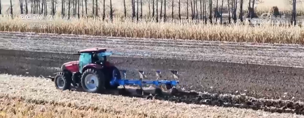 從空中看去,未收獲的地方是呈現(xiàn)金色,收割后的地面,大型的翻地機(jī)跟在后面將秸稈直接翻入地下,翻地車一過就露出油汪汪的黑土地了。這些翻完的地之后還要耙平、起壟,這樣第二年開春可以直接種植了。記者在當(dāng)?shù)夭稍L期間,看到了這些農(nóng)戶幾乎是24小時晝夜不停在進(jìn)行收割和秋整地,可以說是“人歇機(jī)器不歇”,在搶抓農(nóng)時,當(dāng)?shù)赜芯湓捊小敖鹕x田、黑色越冬”。