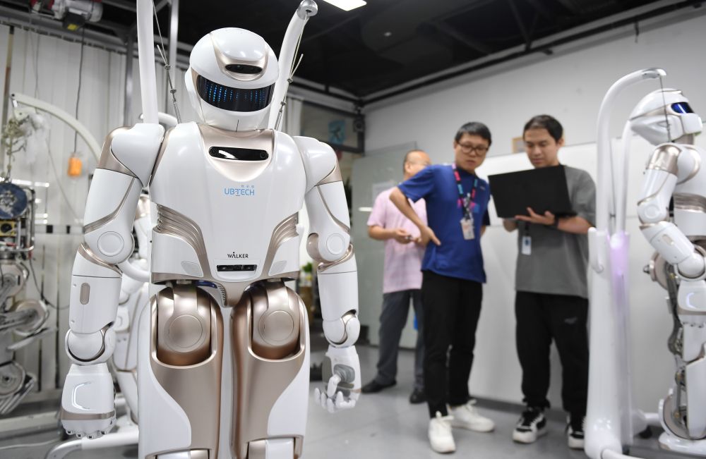 2024年6月26日,在位于深圳市南山區(qū)智園的優(yōu)必選總部,工作人員對(duì)人形機(jī)器人進(jìn)行測(cè)試。新華社記者毛思倩攝