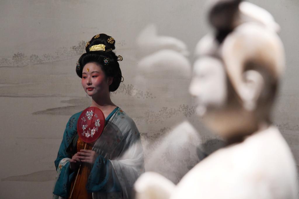 身著復(fù)原唐裝的演員在西安博物院為游客呈現(xiàn)唐朝生活風(fēng)貌。新華社記者 李一博 攝