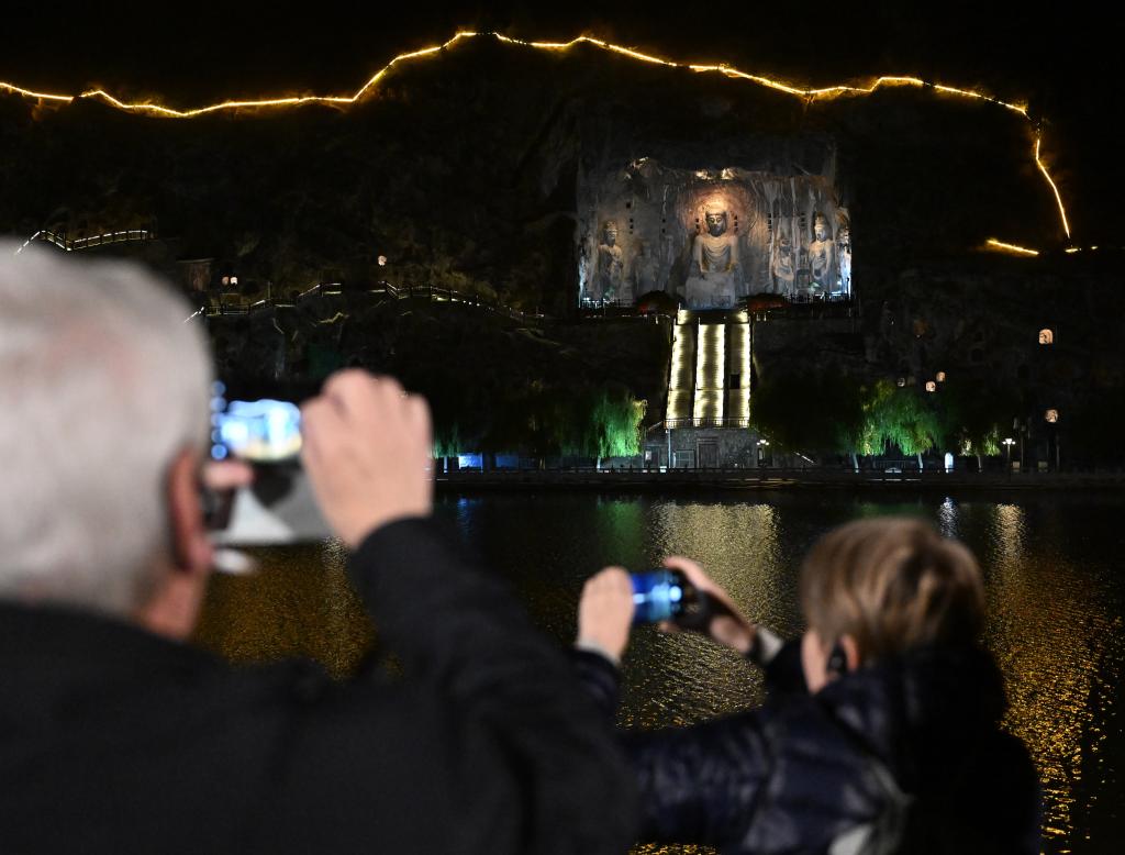 11月4日,外賓在河南省洛陽市龍門石窟景區(qū)禮佛臺(tái)拍照留念。新華社記者 李嘉南 攝