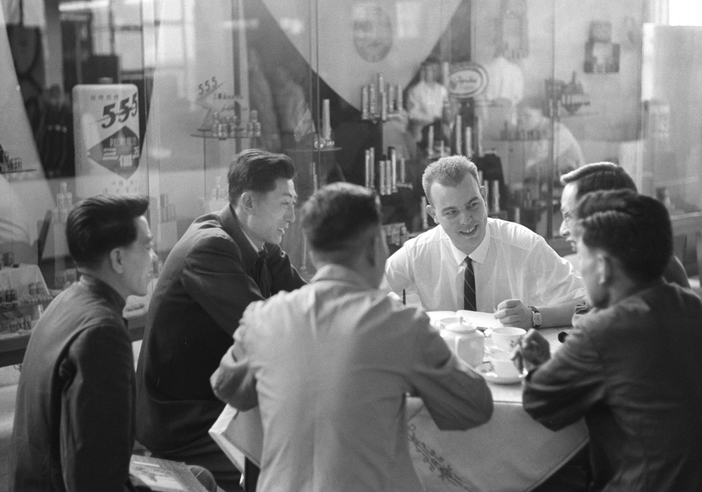 1965年,挪威商人萊伊夫·斯契瓦伯和中國交易團工作人員在第17屆廣交會上洽談交易。新華社記者 蔡忠植 攝