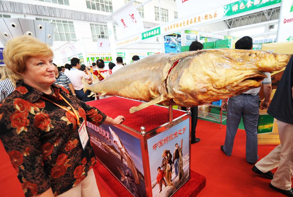 2008年6月15日,在第19屆中國哈爾濱國際經(jīng)濟貿(mào)易洽談會(后與中國-俄羅斯博覽會合并舉辦)上,一位客商在鱘鰉魚標本旁留影。新華社記者 王建威 攝