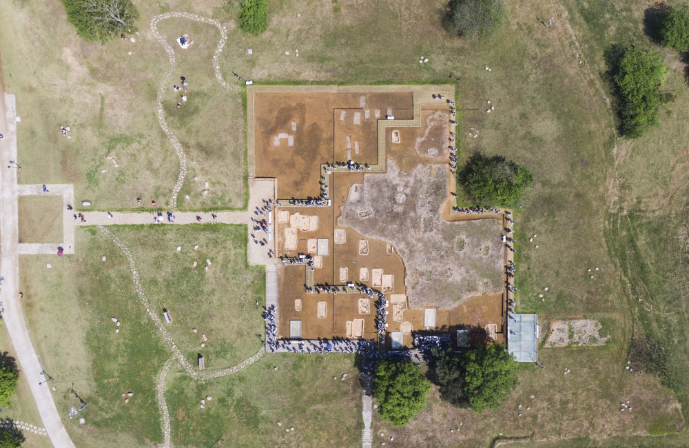 這是2024年4月18日拍攝的位于安徽省馬鞍山市含山縣境內的凌家灘國家考古遺址公園墓葬祭祀區(qū)(無人機照片)。新華社記者 傅天 攝