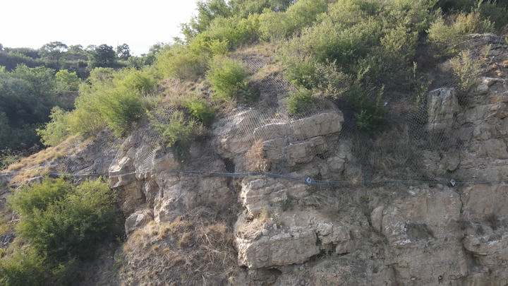 為防止碎石脫落將古棧道掩埋或毀壞,近幾年國家出資對此處棧道上的危巖體進行加固。目前工程已竣工,古棧道上方有專業(yè)防護網,新修的排水溝阻斷了上方雨水對古棧道的沖刷。